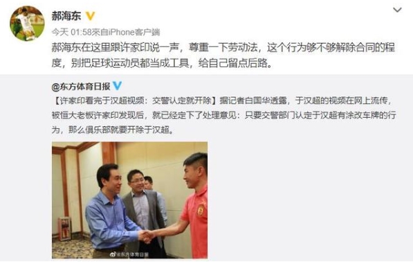 “郝海东在这里跟许家印说一声,尊重一下劳动法,这个行为够不够解除合同的程度,别把足球运动员都当成工具,给自己留点后路。”