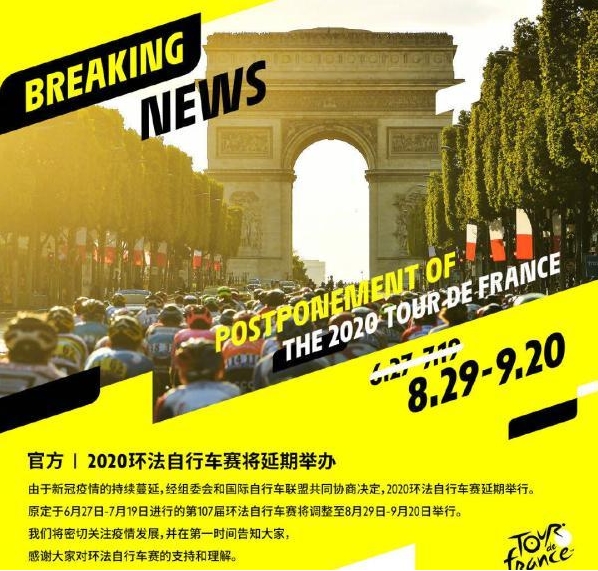 环法自行车赛组委会15日宣布,受新冠肺炎疫情的影响,原定于6月27日至7月19日举行的2020年环法比赛将推迟至8月29日至9月20日举行,比赛路线不变,起点仍为尼斯,终点为巴黎。