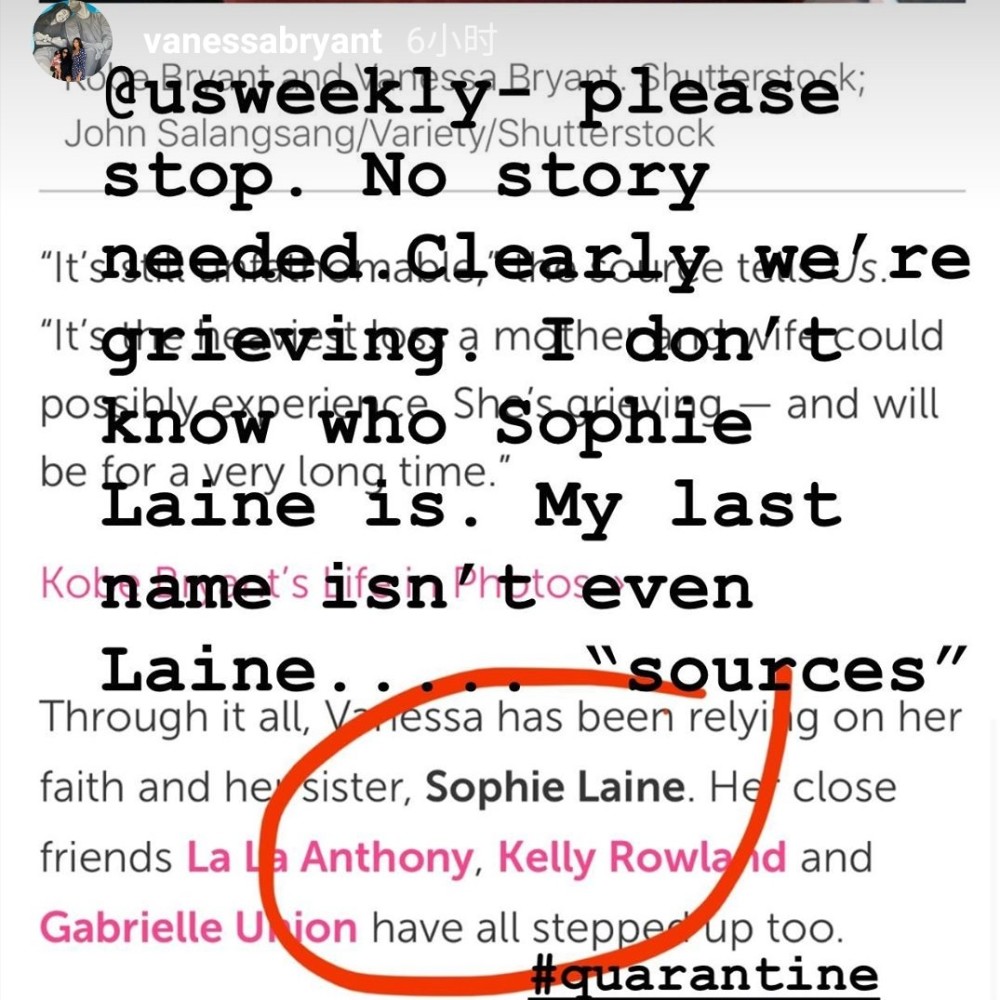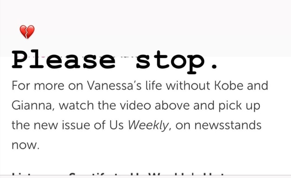Us Weekly在文中最后写道:“欲得知更多瓦妮莎失去科比和吉安娜后的生活,请观看上方的视频……”瓦妮莎截屏了这段话,并写道:“请停下。”她还配上了一个心碎的表情。