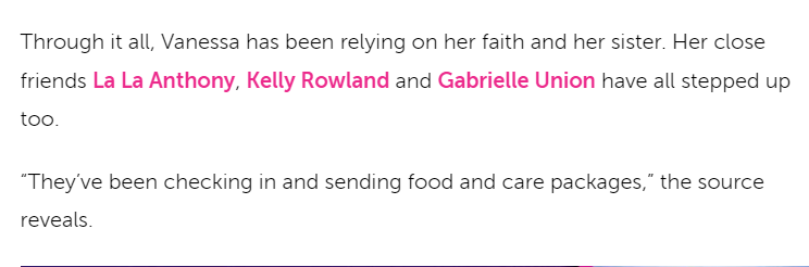 在这个动态前,瓦妮莎还驳斥了Us Weekly文中一段关于自己的报道,报道上写道:“瓦妮莎需要依靠自己的信仰和她的姐妹索菲娅-莱恩(Sophie Laine)挺过去。她的好友拉拉-安东尼、凯利-罗兰德和加布里埃尔-尤妮恩也都向她伸出援手。”