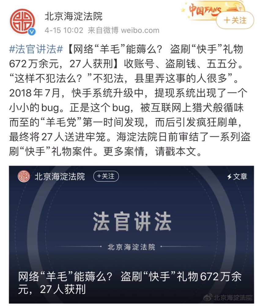 4月16日消息,海淀法院14日通报了一起快手被“薅羊毛”案,涉案27人全部获刑。法院以盗窃罪判处27人一年一个月至十一年半不等有期徒刑。案件主审法官表示,利用网络平台漏洞从事黑色产业链获利,是当前司法打击的重点。