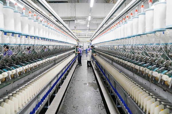 4月16日,在位於青岡縣的黑龍江金達麻業有限公司的生產車間,工人在生產產品。新華社