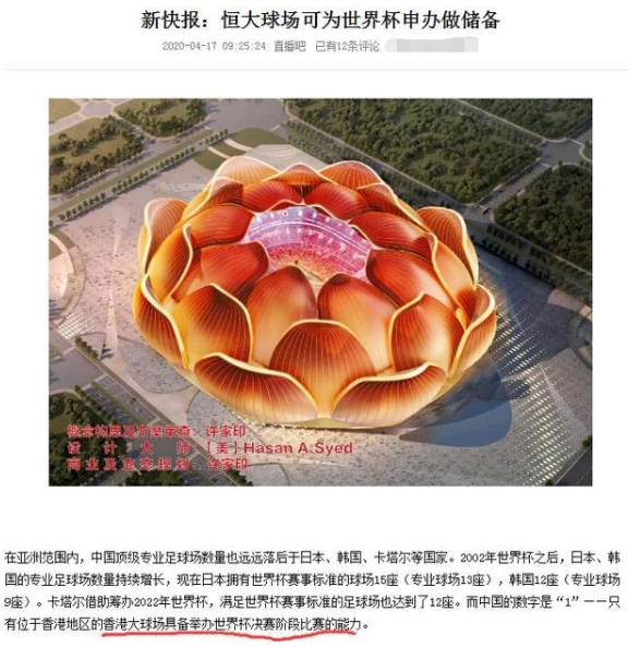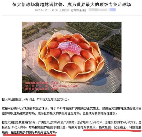 【香港商报网讯】4月16日,全中国的球迷估计都会被恒大的10万人专业足球场效果图所折服。这一天,在广州市长、恒大集团董事局主席许家印等人的见证下,大球场正式开工。投资120亿、历时三年半的设计,来自美国顶级大师Hasan.A.Syed的方案,并融入了许家印亲自构思概念、亲自修改方案、亲自规划商业及业态。2022年底,这座号称世界上最豪华的足球运动场将被投入使用。