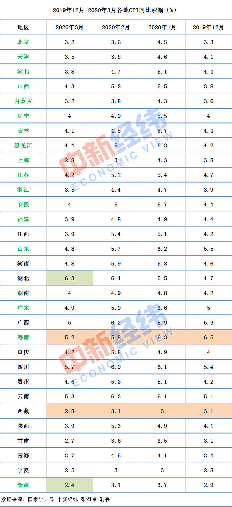 广西、海南、四川、云南5省份3月CPI同比涨幅“破5”;上海、西藏、甘肃、宁夏、新疆3月份CPI处于“2时代”,新疆同比涨幅最低,为2.4%。