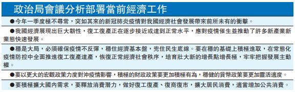 【香港商報網訊】據新華社報道,中共中央政治局昨日召開會議,分析國內外新冠肺炎疫情防控形勢,研究部署抓緊抓實抓細常態化疫情防控工作;分析研究當前經濟形勢,部署當前經濟工作。中共中央總書記習近平主持會議。會議強調,要堅持穩中求進工作總基調。穩是大局,必須確保疫情不反彈,穩住經濟基本盤,兜住民生底線。要在穩的基礎上積極進取,在常態化疫情防控中全面推進復工復產達產,恢復正常經濟社會秩序,培育壯大新的增長點增長極,牢牢把握發展主動權。