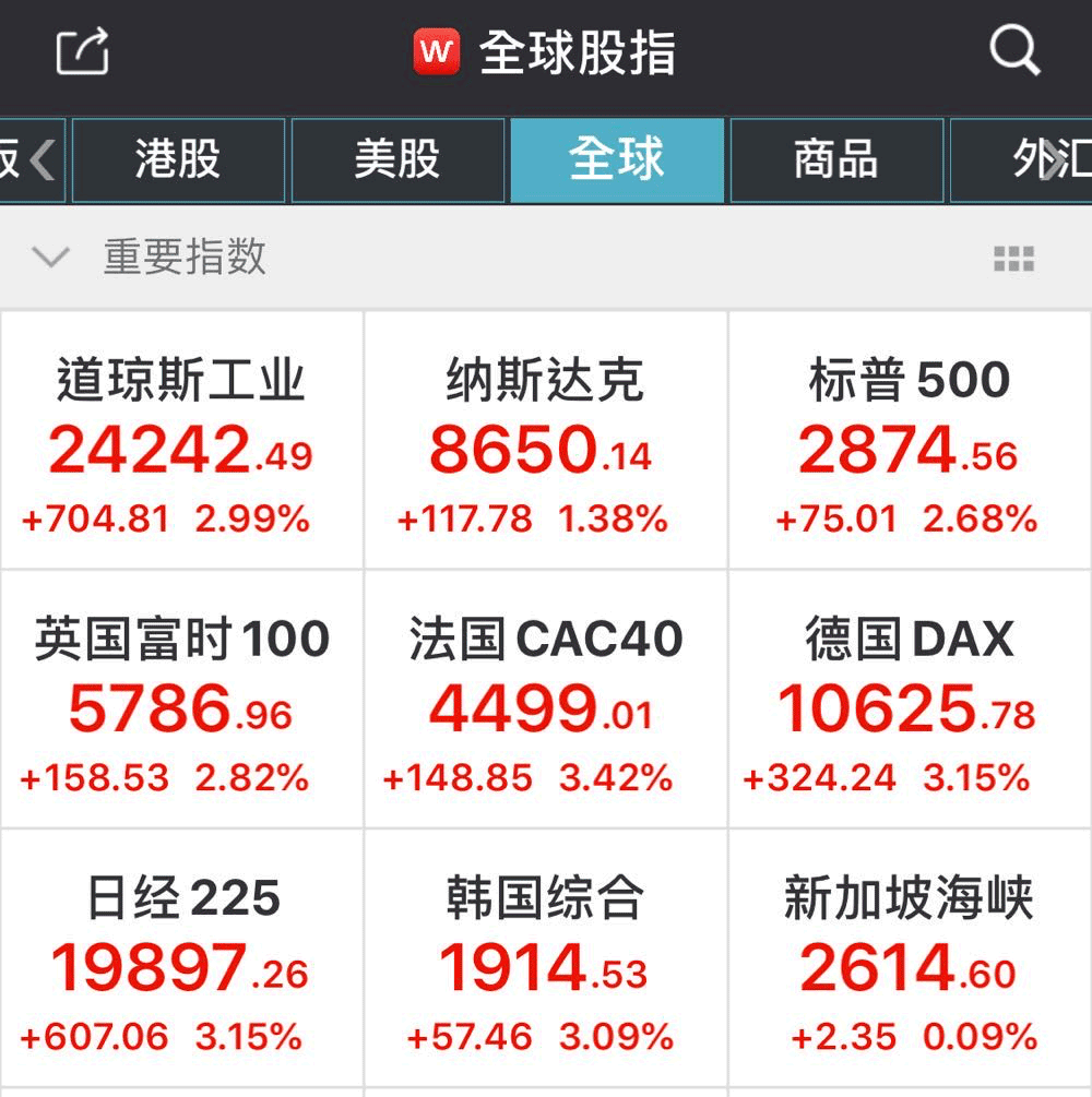 道指收盘上涨704.81点,报24242.49点,涨幅为2.99%,本周累涨2.21%;纳指涨117.78点,报8650.14点,涨幅为1.38%,本周累涨6.09%;标普500指数涨75.01点,报2874.56点,涨幅为2.68%,本周累涨3.04%。