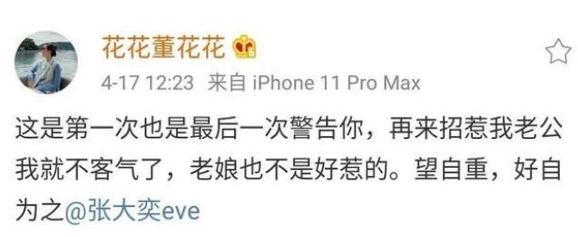 此事的起因是,4日17日,微博ID为“花花董花花”的博主发声手撕当红网红张大奕, “这是我第一次也是最后一次警告你,再来招惹我老公我就不客气了,老娘也不是好惹的。望自重,好自为之同时@张大奕eve”。