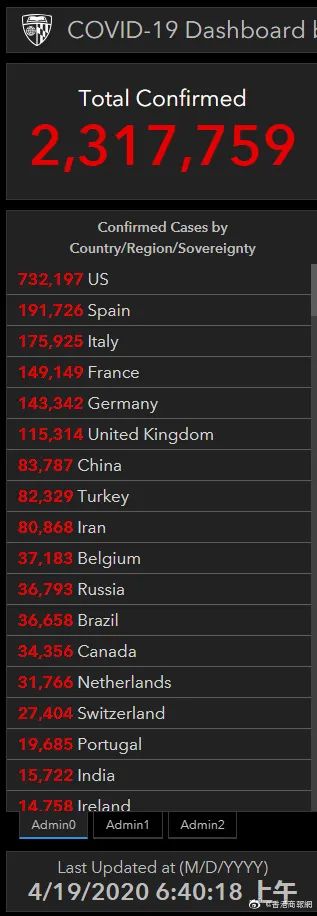 全球新冠肺炎累计达2317759例。据美国约翰斯·霍普金斯大学统计,截至本港时间19日6时30分左右,全球确诊新冠肺炎2317759例,死亡159510例。