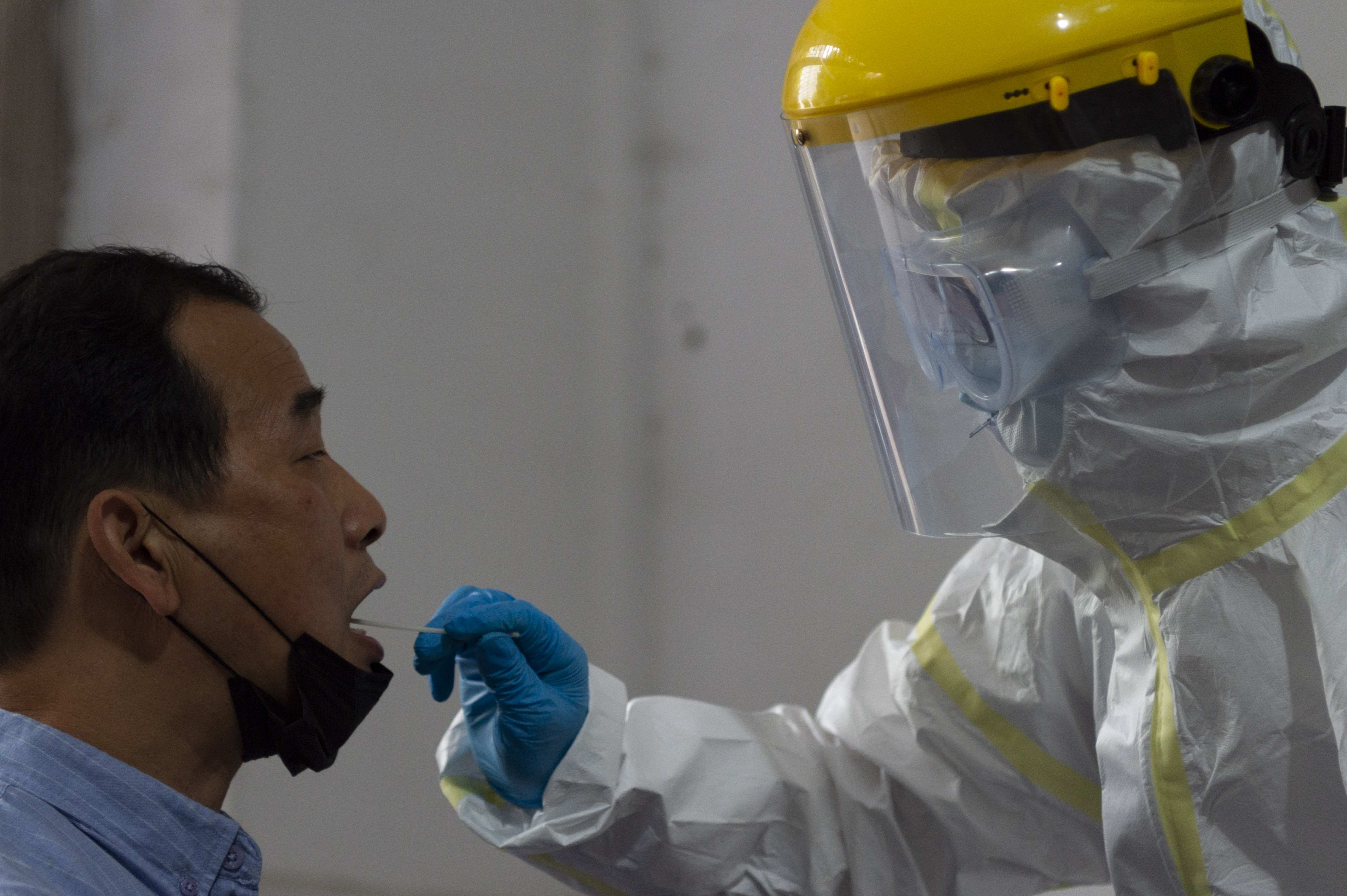 襄陽市教職員工返崗前都需要進行核酸檢測,18日,工作人員樊城區檢測點給一位教師採集咽拭子。