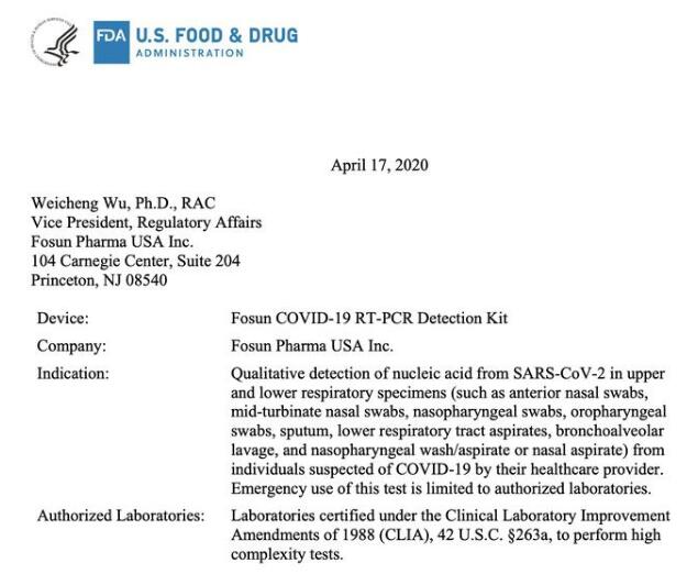 根据美国食品药品监督管理局(“FDA”)网站最新信息,4月17日,复星医药的新型冠状病毒2019-nCov核酸检测试剂盒(荧光PCR法)获得FDA签发的紧急使用授权(EUA)。FDA发布的公告中还显示,该检测的紧急使用仅限于授权实验室。