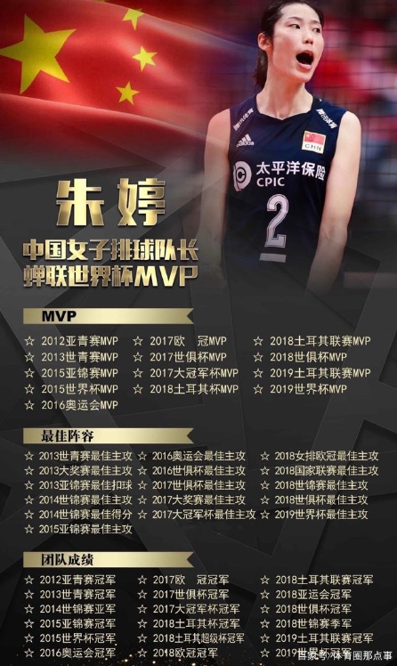 女排是中国三大球项目中比较出色的一个,而朱婷又是女排中现在最优秀的球员之一,作为世界级的球星,朱婷不断帮助国家队争取过荣誉。作为国家队的队长,朱婷屡次在球队被动的时刻挺身而出,帮助球队“转危为安”。2019年,以她为队长的中国女排以11连胜的骄人战绩夺得世界杯冠军,她蝉联最有价值球员和最佳主攻。