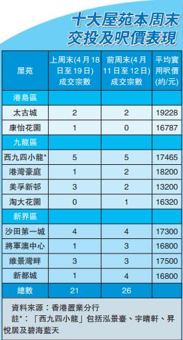 據美聯物業分行統計,剛過去的周末(4月18至19日)10大藍籌屋苑合共錄得約21宗買賣成交,較前周末微跌約4.5%,惟已連續10個周末錄得雙位數,並延續復活節周末的逾20宗的活躍水平。按15大屋苑計算,上周末兩天則錄得約22宗買賣成交,較前周末約33宗跌約33.3%。