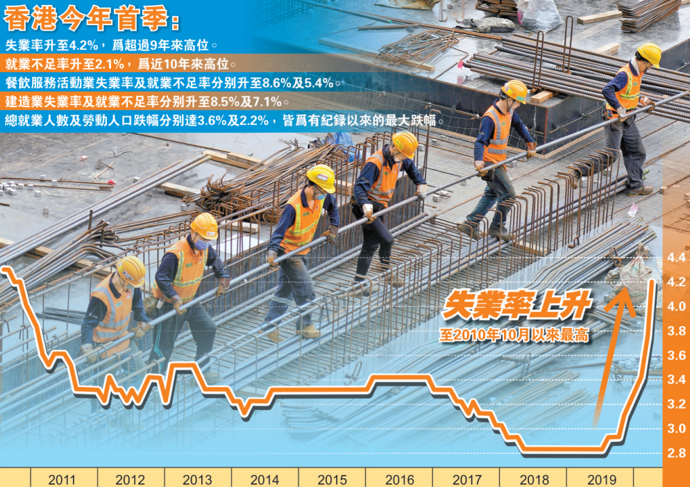 【香港商報网訊】記者戴合聲報道:在黑暴攬炒和新冠疫情雙重夾擊下,政府統計處昨日公布的經季節性調整的失業率急升--由去年12月至今年2月的3.7%,攀升至今年1月至3月的4.2%,為超過9年來高位;就業不足率亦由同期去年12月至今年2月的1.5%,上升至今年1月至3月的2.1%,為近10年來高位。其中,與消費及旅遊相關行業(即零售、住宿及膳食服務業)合計的失業率急升至6.8%,為2009年8月至10月全球金融危機爆發後的最高水平;就業不足率則急升至3.9%,為自2003年6月至8月受「沙士」疫情沉重打擊後的高位。特區政府表示,總就業人數及勞動人口按年跌幅皆創出有紀錄以來最大跌幅,惟相信在多項紓困措施多管齊下,應有助保就業、保飯碗。