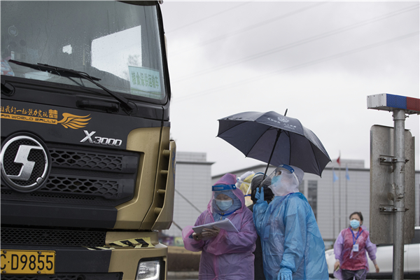 昨日,在綏芬河市入城口,工作人員在雨中給司機測溫。 新華社