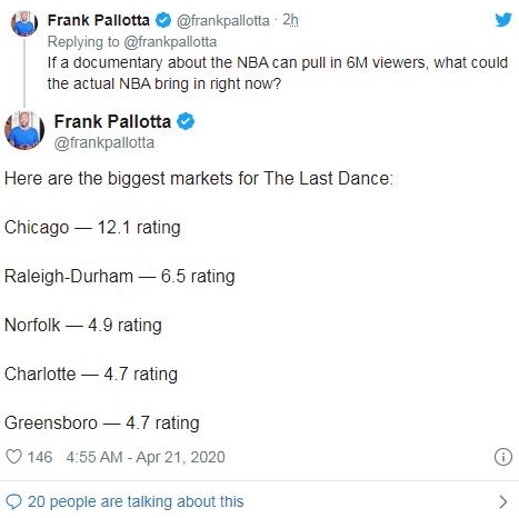 而且这赛季的全明星最后一节还打得很激烈,若是过去的全明星,恐怕还不如乔丹的纪录片受欢迎。而NBA常规赛热门比赛的平均收视人数是150万人,更不如乔丹纪录片受欢迎了,完爆NBA的比赛收视人数。而这部纪录片在芝加哥更是拿下了历史纪录的12.1收视率,这收视率可以说非常夸张了。