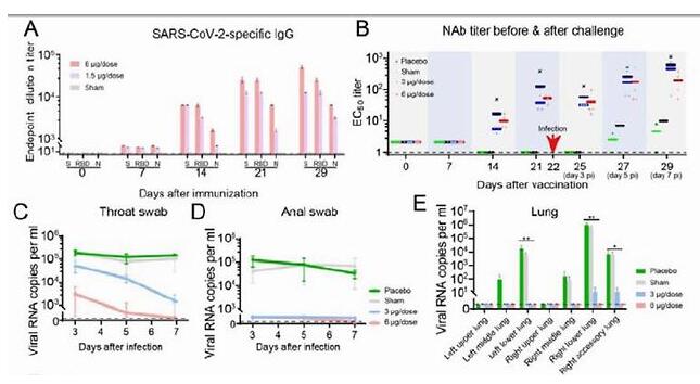 随后研究者在新冠病毒感染的恒河猴中进行了攻毒实验,以评估其免疫原性和保护功效。