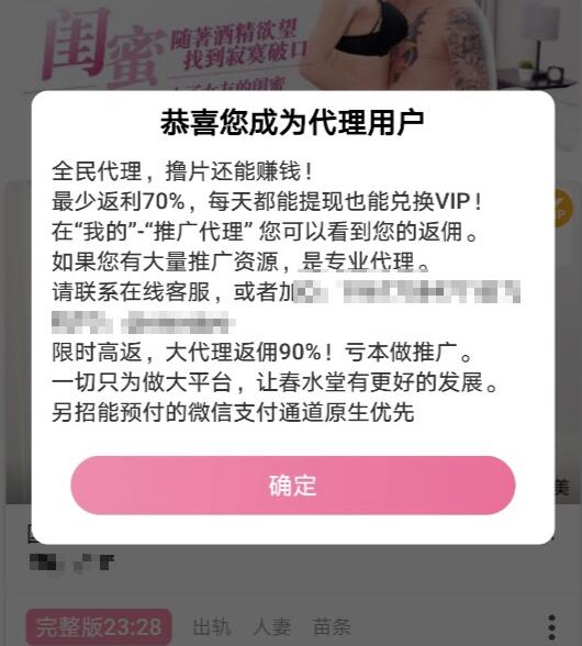 某色情app页面弹窗推广招代理,称大量翻佣。