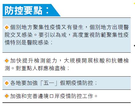 會議指出,目前國內個別地方聚集性疫情又有發生,個別地方出現醫院交叉感染。有關部門要立即派出由疾控專家、醫療專家組成的工作組,指導相關地方抓緊徹查發生聚集性疫情和醫院感染的原因並公開通報,全面查清確診、疑似病例和無症狀感染者、密切接觸者等行動軌跡,儘快阻斷傳播途徑,儘快補上防控短板漏洞,尤其要嚴防醫院感染風險。堅決落實好「四早」措施,實事求是、公開透明發布信息,不得瞞報,壓實地方責任依法處理。各地要引以為戒,高度重視防範聚集性疫情特別是醫院感染。會議指出,做到「四早」首要是早發現。做好常態化防控要加快提升檢測能力,大規模開展核酸和抗體檢測。