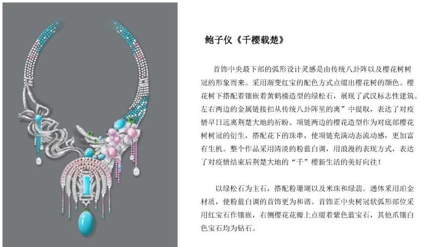 綠松石是湖北盛產的美麗寶石。以綠松石為材料的創造性設計貫穿古今中外,即能富中華傳統「石」之底蘊,又能造夢新銳時尚,也寄予了對未來的美好期盼與祝福。「對湖北的禮讚,對醫護人員的歌頌,對英雄的緬懷,對幸福的期盼,對災難的反思;在設計師的筆下,感人肺腑的事迹,人性的光輝,團結的力量化成寶石,閃耀着衝破黑夜的光芒,這就是珠寶人用行動書寫的溫暖。」珠寶博物館負責人表示。