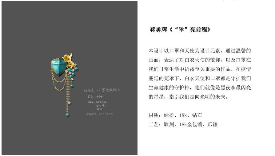 據展覽聯合主辦方深圳珠寶博物館與中國地質大學(武漢)珠寶學院表示,他們會將部分入圍作品打造成珠寶作品,並在5月18日開展的「荊楚松綠——綠松石主題特展」中展出,並邀廣大市民朋友一起來欣賞抗疫過程中珠寶美的力量!