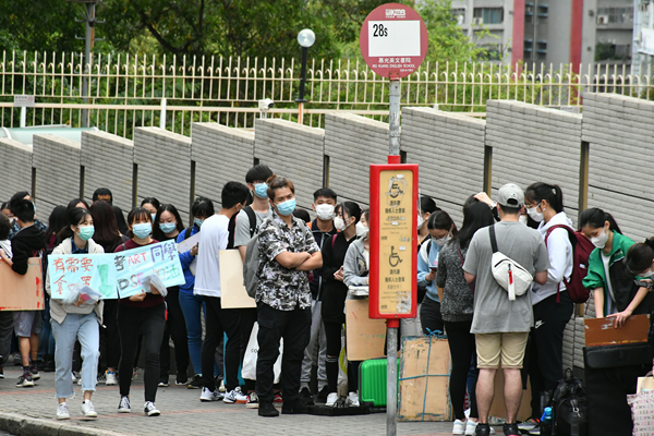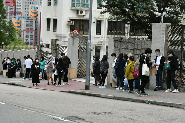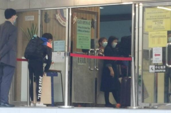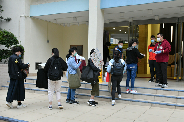 在觀塘慕光英文書院,早上还沒到7時已有大批考生在校門外等候,校方在7時45分讓考生陸續進入試場,為他們量度體溫及收回健康申報,並向每位考生送贈消毒搓手液。