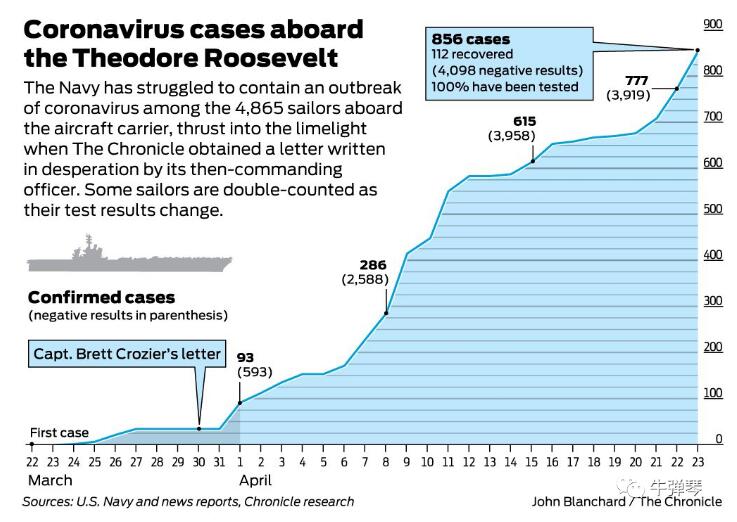 美国媒体登了一张图,可见航母疫情的惨烈,最终,航母共4865名船员,确诊856人。