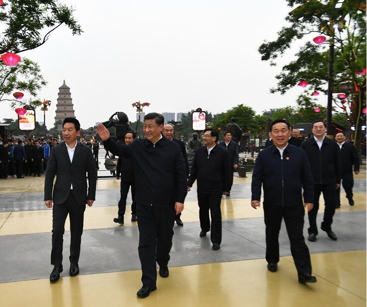 4月20日至23日,中共中央总书记、国家主席、中央军委主席习近平在陕西考察。这是4月22日,习近平在西安大唐不夜城步行街考察时,向游客挥手致意。 新华社记者 谢环驰 摄