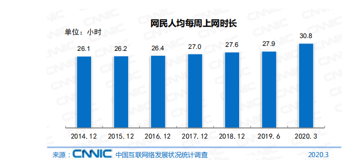 《報告》顯示,截至2020年3月,中國網民的人均每周上網時長為30.8個小時,較2018年底增加3.2個小時。受2020年初新冠肺炎疫情影響,網民上網時長有明顯增長。