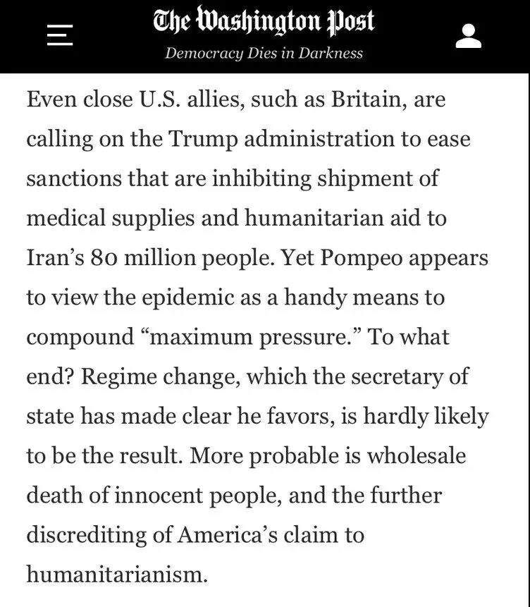 联合国人权事务高级专员米歇尔·巴切莱特日前批评说,“制裁会阻碍医疗工作开展,使整个世界处于危险之中。” 包括美国前国务卿奥尔布赖特、世界卫生组织前总干事布伦特兰等24名欧美前政要前不久也签署联合声明,指出美国对伊朗“极限施压”影响伊朗医疗体系的抗疫表现。《华盛顿邮报》日前的一篇评论一针见血地指出,在伊朗八千万民众面临人道主义援助困境之际,蓬佩奥等政客不顾英国等西方国家放松制裁的呼吁,将疫情视为深化“极限施压”的便利手段,可能导致大批无辜民众死亡,美国标榜的人道主义会更加不得人心。