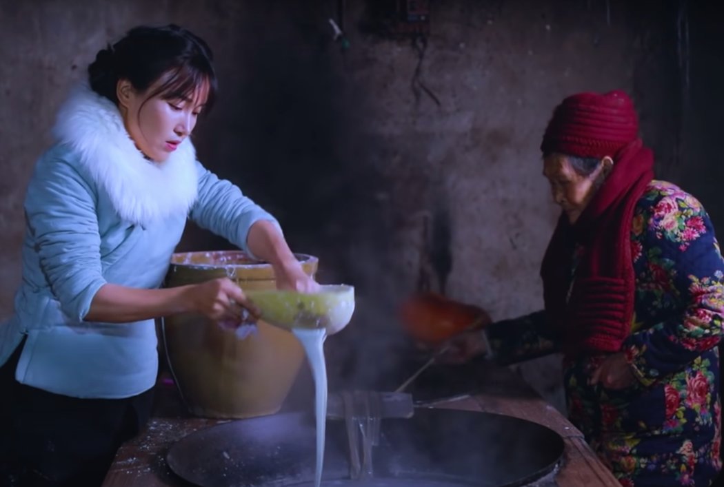 李子柒用红薯提取淀粉做成面糊,制作传统粉条,然后在祖母帮助下过滤,放进沸水中。