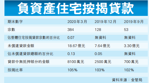 根據金管局公布的最新數據,今年首季香港錄384宗負資產個案,是自2016年第二季後15個季度新高。金管局稱,這些個案涉及銀行職員的住屋按揭貸款或按揭保險計劃的貸款,這類貸款的按揭成數一般較高。負資產住宅按揭貸款涉及的金額由去年第4季末的7.64億港元,增加至今年第1季末的18.67億港元。負資產住宅按揭貸款中無抵押部分的金額由去年第4季末的2500萬港元,增加至今年第1季末的8100萬港元。