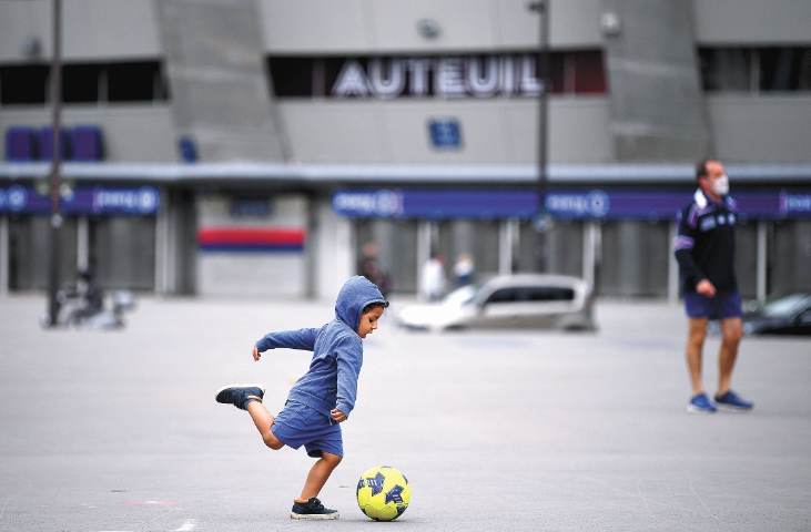 當地時間4月28日,一名孩子在法國巴黎街頭踢球。新華社