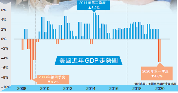 第一季GDP出現急劇下滑,顯示經濟正走向一定的衰退,同時宣告美國有史以來最長的經濟擴張已經結束。由於市場預期美國第二季經濟進一步下滑,首季數字幾乎可確認將連續兩季收縮,意味着自2009年中開始的擴張期告一段落,步入衰退。