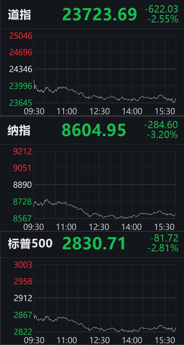 截至收盘,道指跌622.03点,跌幅2.55%,报23723.69点;纳指跌284.6点,跌幅3.2%,报8604.95点;标普500指数跌81.72点,跌幅2.81%,报2830.71点。
