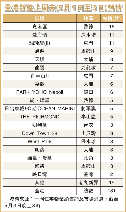 香港一連4日長假期剛過去,新盤市場「熱辣辣」,即使欠全新盤銷售下,首兩天假期交投氣氛亦不俗,約131伙新盤餘貨有交投。