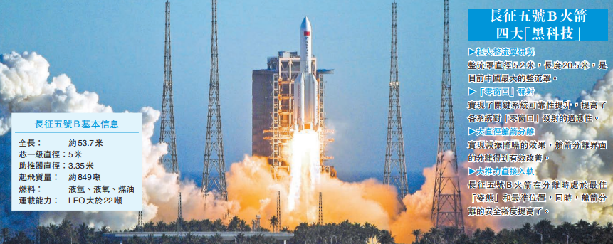據悉,長征五號B以長征五號運載火箭為基礎改進研製而成,主要承擔?中國太空站艙段等重大航天發射任務。長征五號B全長約53.7米,芯一級直徑5米,捆綁4個直徑3.35米助推器,整流罩長20.5米、直徑5.2米,採用無毒無污染的液氧、液氫和煤油作為推進劑,起飛質量約849噸,近地軌道運載能力大於22噸,是目前中國近地軌道運載能力最大的火箭。