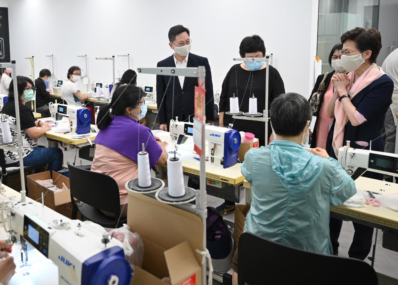 行政長官林鄭月娥(右)昨早上到荃灣視察 「銅芯抗疫口罩」 其中一個生產點,並感謝工作人員和工友連月來 積極投入生產。 政府新聞處圖片