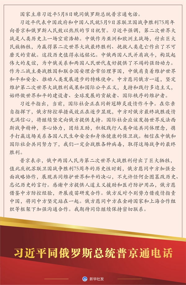 习近平代表中国政府和中国人民就5月9日苏联卫国战争胜利75周年向普京和俄罗斯人民致以热烈的节日祝贺。习近平强调,第二次世界大战是人类历史上一场空前浩劫。中俄作为亚洲和欧洲主战场,付出巨大民族牺牲,为赢得第二次世界大战最终胜利、挽救人类危亡作出了不可磨灭的贡献。这段历史值得永远铭记。中俄两国人民并肩战斗,构筑起伟大的友谊,为中俄关系和两国人民世代友好提供了不竭的强劲动力。作为二战主要战胜国和联合国安理会常任理事国,中俄肩负着维护世界和平和安全、推动人类发展进步的特殊使命。中方愿同俄方一道,坚定维护第二次世界大战胜利成果和国际公平正义,支持和践行多边主义,始终做世界和平的建设者、全球发展的贡献者、国际秩序的维护者。