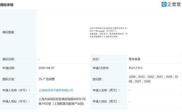 据企查查数据显示,4月7日,上海妆佳电子商务有限公司申请注册声音商标“oh my god,买它买它!”,商标国际分类为35-广告销售,目前状态为等待审查。