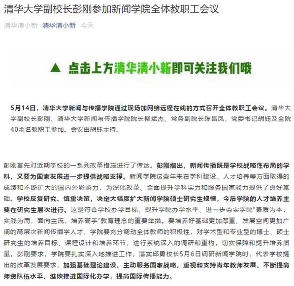 【香港商报网讯】据内地媒体报道,5月15日,清华大学新闻与传播学院团委公号发布消息,清华大学新闻与传播学院召开全体教职工会议,清华大学副校长彭刚传达改革措施:学校反复研究、慎重决策,决定大幅度扩大新闻学院硕士研究生规模,今后学院的人才培养主要在研究生层次进行。