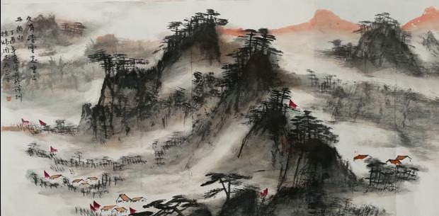 看宏兴先生系列山水画,感受画家的博大胸怀,巍峨高山充满恢宏伟岸的阳刚豪迈,波澜起伏的大河激荡着沁人心脾的柔情,看那远帆不畏汹涌激流乘风破浪驶向彼岸,看那苍翠劲松顶风屹立在乱云飞渡的峭壁悬崖之上,犹如置身于空灵世界,恍如穿越时空到了陶渊明的世外桃源。宏兴先生对泼墨山水画的意境追求有自己的见解:“笔断意连,线断韵不断,云散气不散,运笔尽在瞬息间方见乾坤之大”。正如中国画讲究画贵在含蓄,笔虽未到却意境深远。