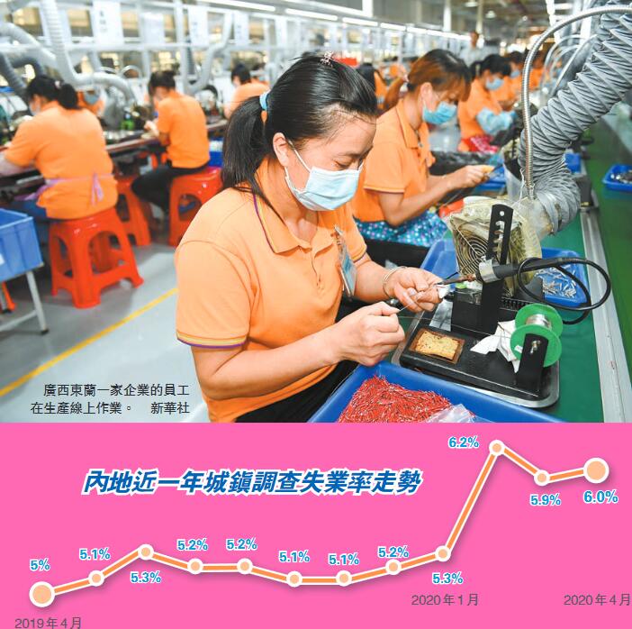 由於新冠肺炎疫情導致企業停工停產、服務業停商停市,2月城鎮調查失業率衝高至6.2%,為2018年公布該數據以來最高值;3月雖小幅回落至5.9%,但依然處於高位;4月為6.0%,比上月又小幅上升0.1個百分點,凸顯就業形勢的嚴峻。