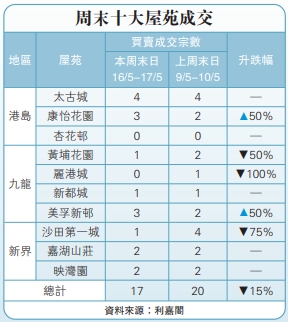 周末新盤成為市場焦點,二手樓市成交量輕微減少。綜合利嘉閣地產分行網絡數據,在過去的周末日(5月16至17日)十大指標屋苑錄得17宗二手買賣個案,較上周末(5月9至10日)的20宗下跌15%。