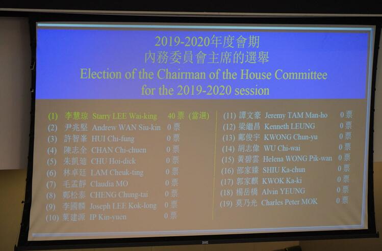 【香港商报网訊】財委會主席陳健波今日上午11时主持立法會內務委員會主席選舉,由于反对派议员的捣乱,會議一度被暂停。內會恢復會議並進入投票程序。陳健波宣佈,李慧琼40票當選主席。