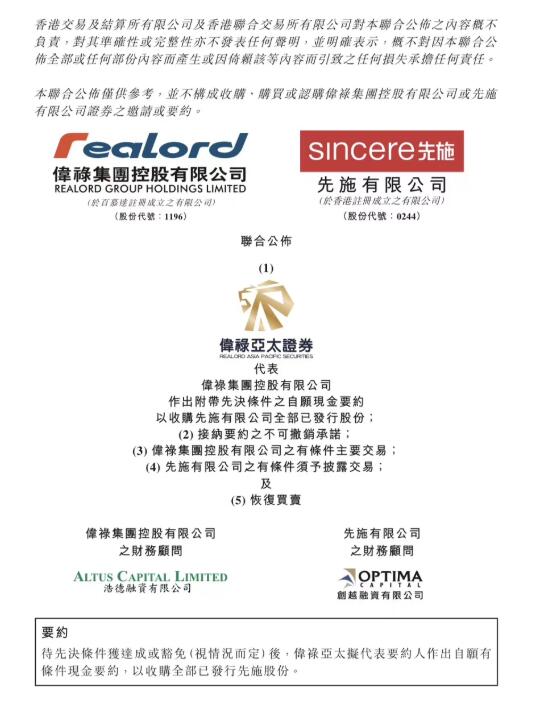 香港交易及結算所有限公司、香港聯合交易所有限公司聯合發佈,先施百貨偉祿集團(1196.HK)提出要約收購