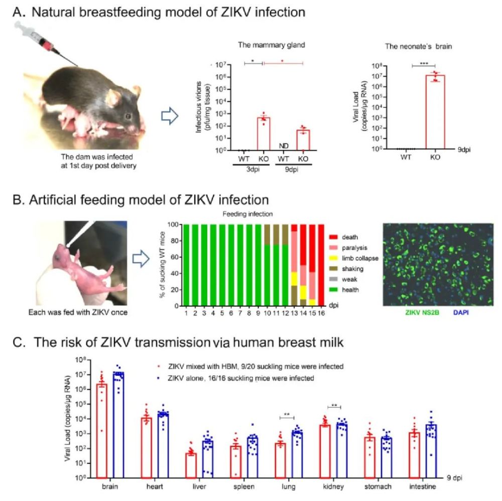 图:小鼠模型研究证实哺乳可传播寨卡病毒。A.在自然哺乳模型中,ZIKV可以通过母乳感染A129乳鼠;B.在人工哺乳模型中,C57Bl6乳鼠饲喂ZIKV可被感染并致神经系统病征;C.人乳汁具有一定抗病毒活性但不能阻断ZIKV可感染C57Bl6乳鼠。