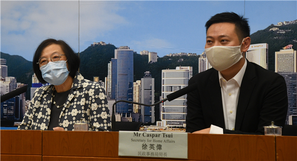 食物及衛生局局長陳肇始(左)、民政事務局局長徐英偉(右)昨公布延長限聚令詳情。 記者 蔡啟文攝