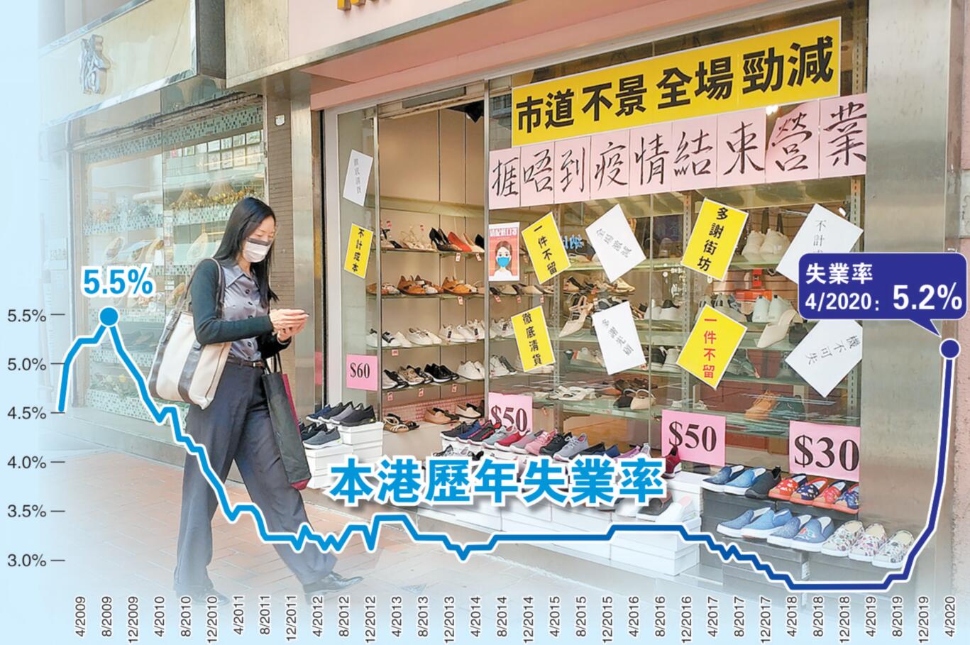 昨日,政府統計處發表的最新勞動人口統計數字,經季節性調整的失業率由1月至3月的4.2%上升至2月至4月的5.2%,為超過10年來的高位。就業不足率亦由1月至3月的2.1%上升至3.1%,為超過15年來的高位,兩者皆為有紀錄以來的最大升幅。總就業人數由372萬人,下跌至2月至4月的365.74萬人,減少約6.26萬人。同期的總勞動人口亦下跌至385.98萬人,減少約2.243萬人。失業人數(不經季節性調整)則增加4.03萬人,至20.25萬人;同期的就業不足人數亦升至11.86萬人。
