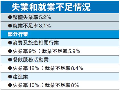 羅致光表示,與消費及旅遊相關行業合計的失業率急升至9.0%,為超過15年來的高位,就業不足率則急升至5.9%,為有紀錄以來的最高位。他說,餐飲服務活動業的失業率及就業不足率分別急升至12.0%及8.4%;建造業的情況同樣嚴峻,其失業率及就業不足率分別上升至10.0%及8.0%。至於其他行業,勞工市場情況亦惡化,尤其在教育業、資訊及通訊業、專業及商用服務業,以及藝術、娛樂及康樂活動業。他指,勞工市場在短期內將繼續面對巨大壓力,為保持經濟活力,政府已推出歷來最大規模的紓困措施,將會密切留意相關情況。