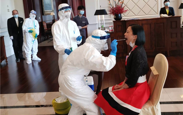 港區全國人大代表、全國政協委員一行200多人,昨早在灣仔乘坐專車,經深圳灣口岸到達深圳。其後,穿上全套防護服的檢驗人員在口岸上車,收集一眾人大代表、政協委員於過去14天的體溫紀錄和健康申報表,並為他們量度體溫,過程嚴謹。一行人到達麒麟山莊後,再有檢疫人員為他們採集喉嚨唾液樣本作化驗。他們居住的酒店房間內亦有通告,提示入住人士要留在房間,不准外出,酒店會送餐到房間。